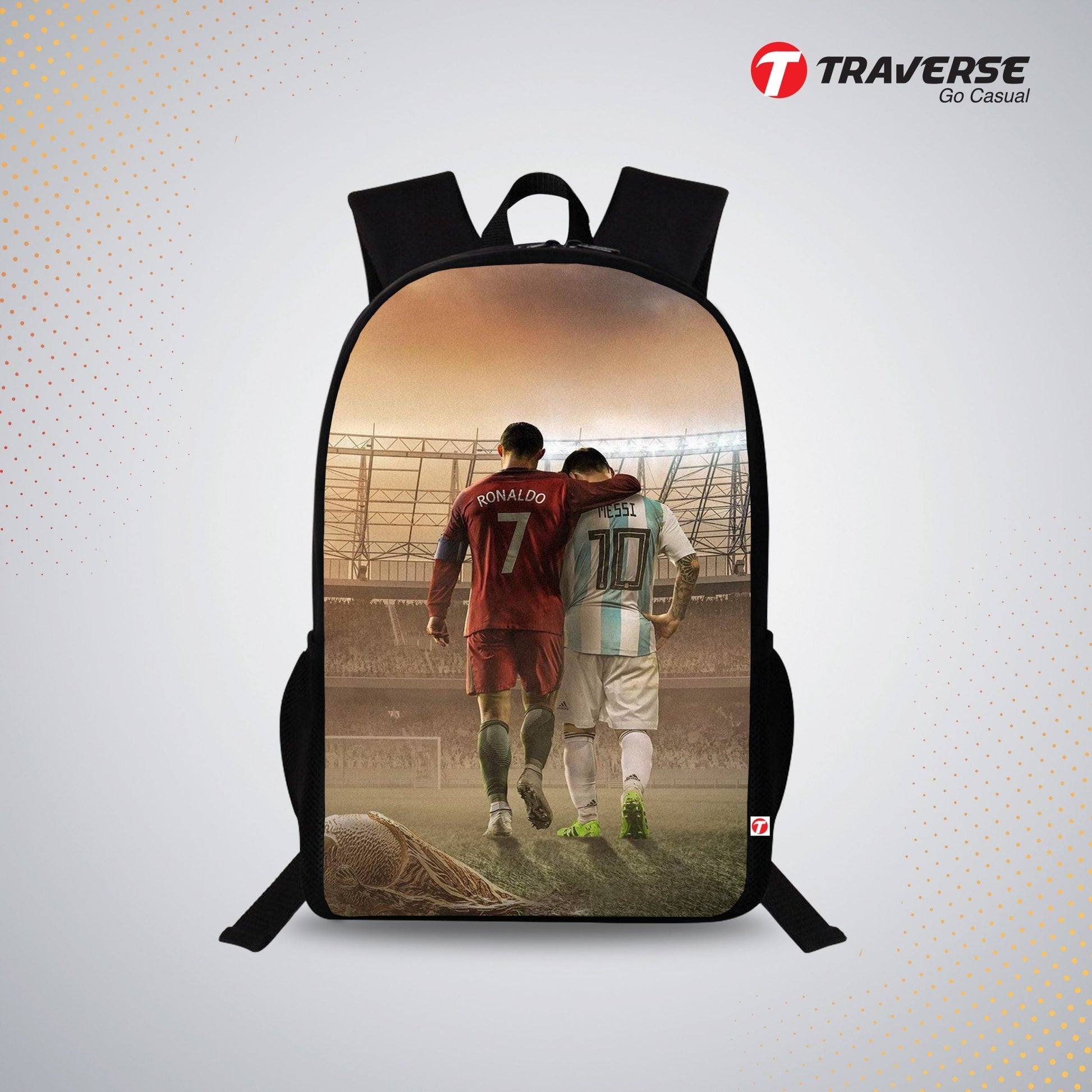 Traverse Ronaldo & Messi Bags For Boys & Girls. Digitally printed on Fabric with latest technology. Dual Compartment large backpack